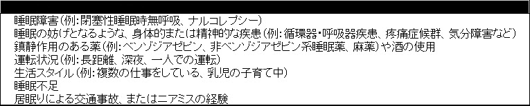 この項目は、五〇〇人の居眠り運転ドライバーと、一〇〇〇人の健常ドライバーを比較した研究などによって証明されています。{Stutts, 2003 #2802} 健常ドライバーと比較して、居眠り運転ドライバーは、仕事の兼業、不規則な勤務時間、夜間の運転、睡眠不足、睡眠の質の低下、鎮静作用のある薬の内服などの割合が高くなっていました。